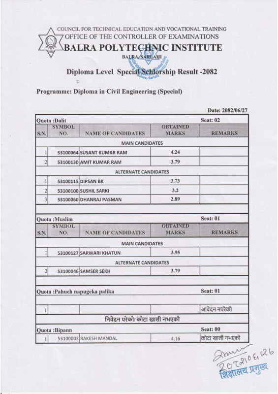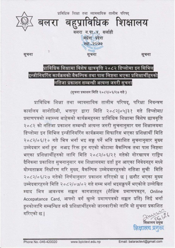 प्राविधिक शिक्षामा विशेष छात्रवृत्ति २०८२ डिप्लोमा इन सिभिल इन्जीनियरिंग कार्यक्रमको वैकल्पिक तथा पास लिष्टमा भएका प्रशिक्षार्थीहरुको नतिजा प्रकाशन सम्बन्धी अत्यन्त जरुरी सुचना